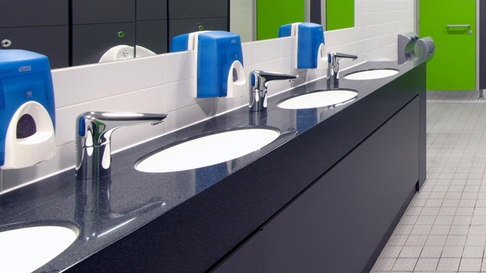 • Solid surfacing materials: Designed for long term, low maintenance use. Solid colour throughout its thickness, virtually seamless joints and is water and mark resistant. A choice of inlays, colour bands and patterns available for our compact grade vanity units